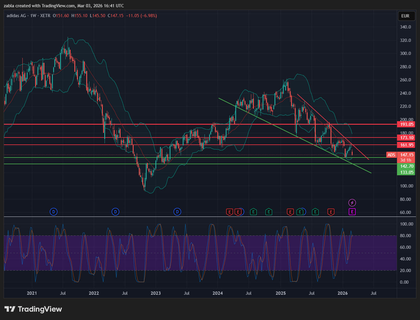 Összességében a technikai és fundamentális kép jelenleg stabilnak mondható, de az árfolyam rövid távú alakulása erősen függ a szélesebb piaci hangulattól és az ellátási láncokat érintő globális fejleményektől. valamint attól is, hogy ebből a csökkenő háromszögből mikor és hogyan tud kitörni. A piaci helyzet igen feszült, már csak az a kérdés, hogy mit jelent a cég, és ezt hogyan ítélik meg a befektetők. Egyenlőre még kicsi csökkenés van az Adidas árfolyamában, de könnyen érkezhet egy kellemes emelkedés, mert a rést be kell tölteni! A további csökkenést erősíti a geopolitikai feszültség mellet a heti RSI indikátor eladási jelzése. Forrás: több pénzügyi oldal.