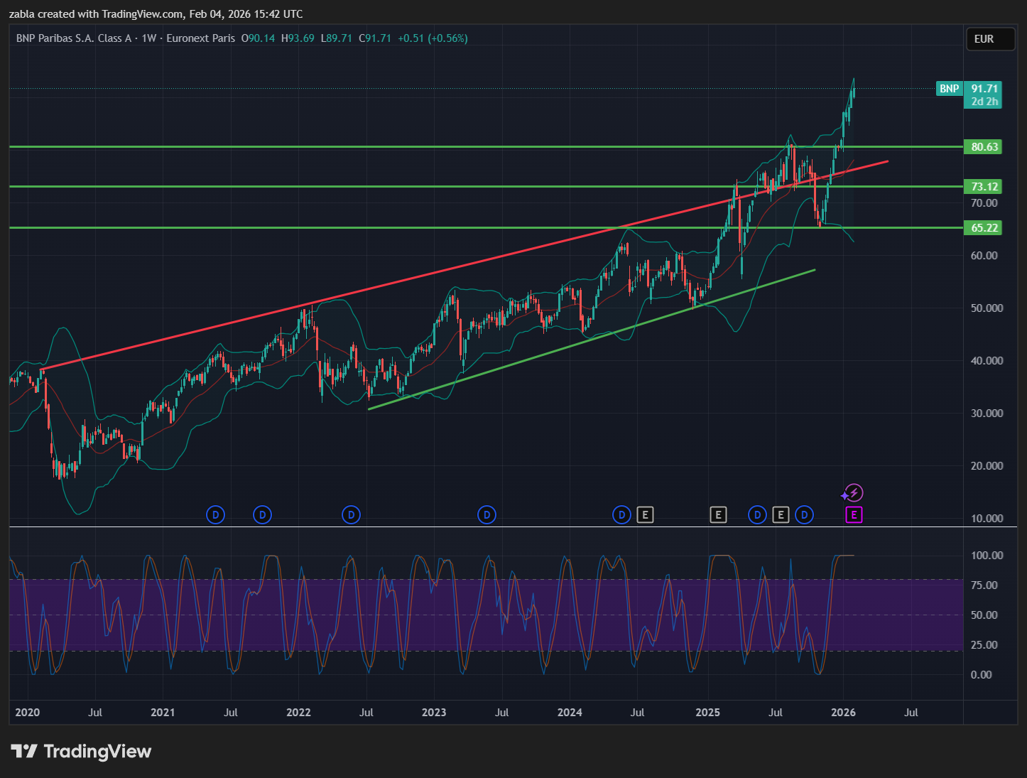 BNP Paribas francia bank túlvett szinten. A BNP Paribas francia bank 2026. február 5-én teszi közzé a 2025. negyedik negyedéves jelentését, ahol az elemzők körülbelül 1,34 dollár részvényenkénti eredményt várnak. A jelentéstől pozitív meglepetést remélnek, főként az befektetési banki szegmens erős teljesítménye miatt, de óvatosságot vetít előre a 2026-os 800 millió eurós szerkezetátalakítási költségek.