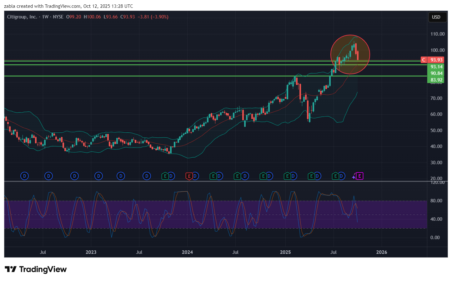 Öszefoglalás: A Citigroup részvénye vegyes technikai képet mutat: míg az RSI túladott állapotot jelez, ami vételi lehetőségeket sugall, a mozgóátlagok alatt kereskedik. Az elemzői várakozások szerint erős harmadik negyedéves eredmények várhatók, különösen a befektetési banki szegmensben. A vállalat stabil osztalékfizetési politikát folytat 2,56%-os hozammal. A versenykörnyezet intenzív marad a nagy amerikai bankok között, de a Citigroup globális jelenléte és átszervezése pozitív kilátásokat nyújtanak. A heti Citigroup árfolyama egyenlőre már a második hete erőteljesen csökken. Igaz lassan támaszhoz ér, és ez várhatja be a gyorsjelentést, mely felkavarhatja a mostani helyzetképet. forrás: több pénzügyi oldal