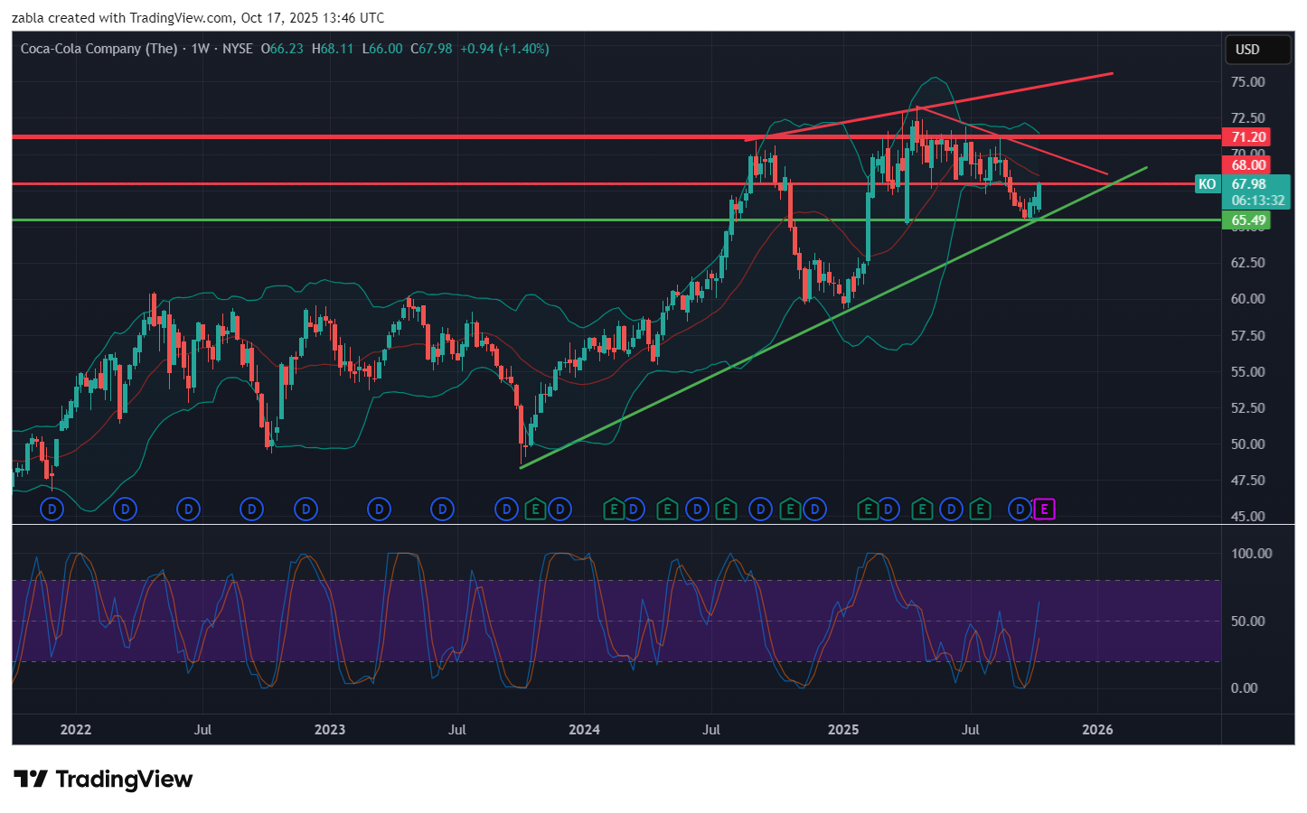 A befektetők a közelgő gyorsjelentési hívás során figyelemmel fogják kísérni a vezetőség kommentárjait a fogyasztói keresletről, a nemzetközi piaci körülményekről és a jövőbeli előrejelzésekről. A heti KO grafikon igen kedvező képet mutat. Ami azt jelenti, hogy az intenzív emelkedés tovább folytatódhat. 71 $ felett újabb csúcsok alakulhatnak ki, mely 75 $ környékéig is húzhatják az árfolyamot. A ferde piros ellenállási vonal áttörése döntő tényező lehet. Lefele, akkor lehet gond, ha a 65 $-os szint letörik, illetva ha a zöld ferde emelkedő csatorna támasza sérül meg. forrás: tobb pénzügyi oldal