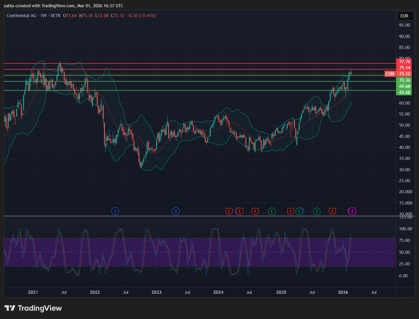 Összességében a Continental heti árfolyama ellenállásba érkezett a jelentés előtt 75 euró környékén. A heti RSI indikátor egyenlőre nem mutat túlvett szinteket, de azért némileg kezd túlvett szintet mutatni. Érdekes lehet a cég, érdemes figyelemmel kísérni, főleg a vezetői nyilatkozatok tartalma után.