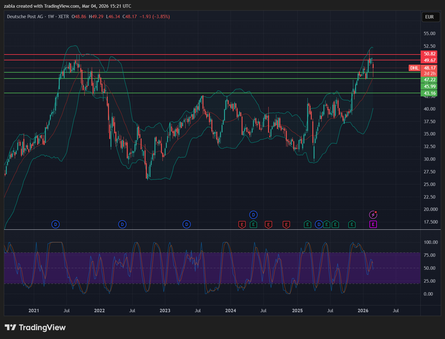 Összességében a DHL Group egy jól pozicionált, defenzív tulajdonságokkal is rendelkező iparági vezető, amely képes profitálni a globális kereskedelem digitális és zöld átalakulásából. A heti DHL-Deutsche Post árfolyama lefordult a jelentés előtt, ez betudható a háborús helyzetnek, mely üzemagyag áremelési félelmeket jeleznek, ami természetesen költségnövekedést eredményez. Az 50-52 eurós ellenállás egy igen meghatározó szint. Egyenlőre bizonytalanság az árfolyam körül, de a holnapi jelentés egyenesbe rakja a befektetők elképzelését. Stabil cégről beszélhetünk, a magas 4% körüli osztalékkal kapcsolatban is. Forrás: több pénzügyi oldal
