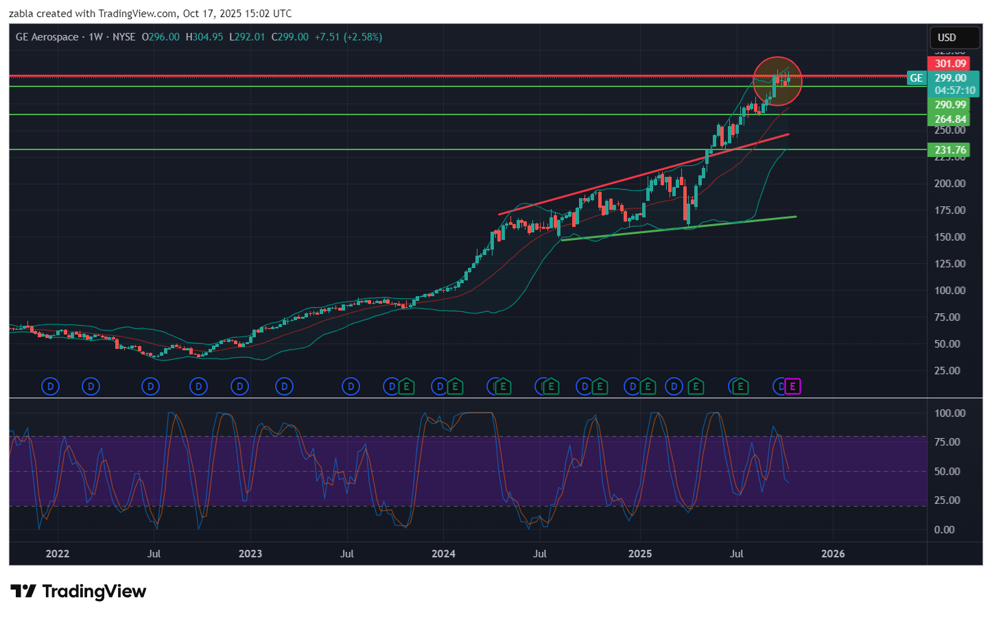A GE Aerospace 2025 Q3 gyorsjelentés kiugró növekedést, de kihívásokkal teli működési környezetet jelez: stabil alapok, innováció, vezető piaci pozíció, de makrogazdasági és iparági gondok mérséklik a kilátásokat. A heti grafikon csúcsot ért el. Ez a 300 $-os szint igen meghatározó szint a kitöréshez viszonyítva is. Itt a tényleges nagyobb elmozdulást a 4 nap múlva érkező gyorsjelentés fogja befolyásolni. Érdemes lesz figyelemmel kisérned a GE Aerospace híreit. forrás: több pénzügyi oldal