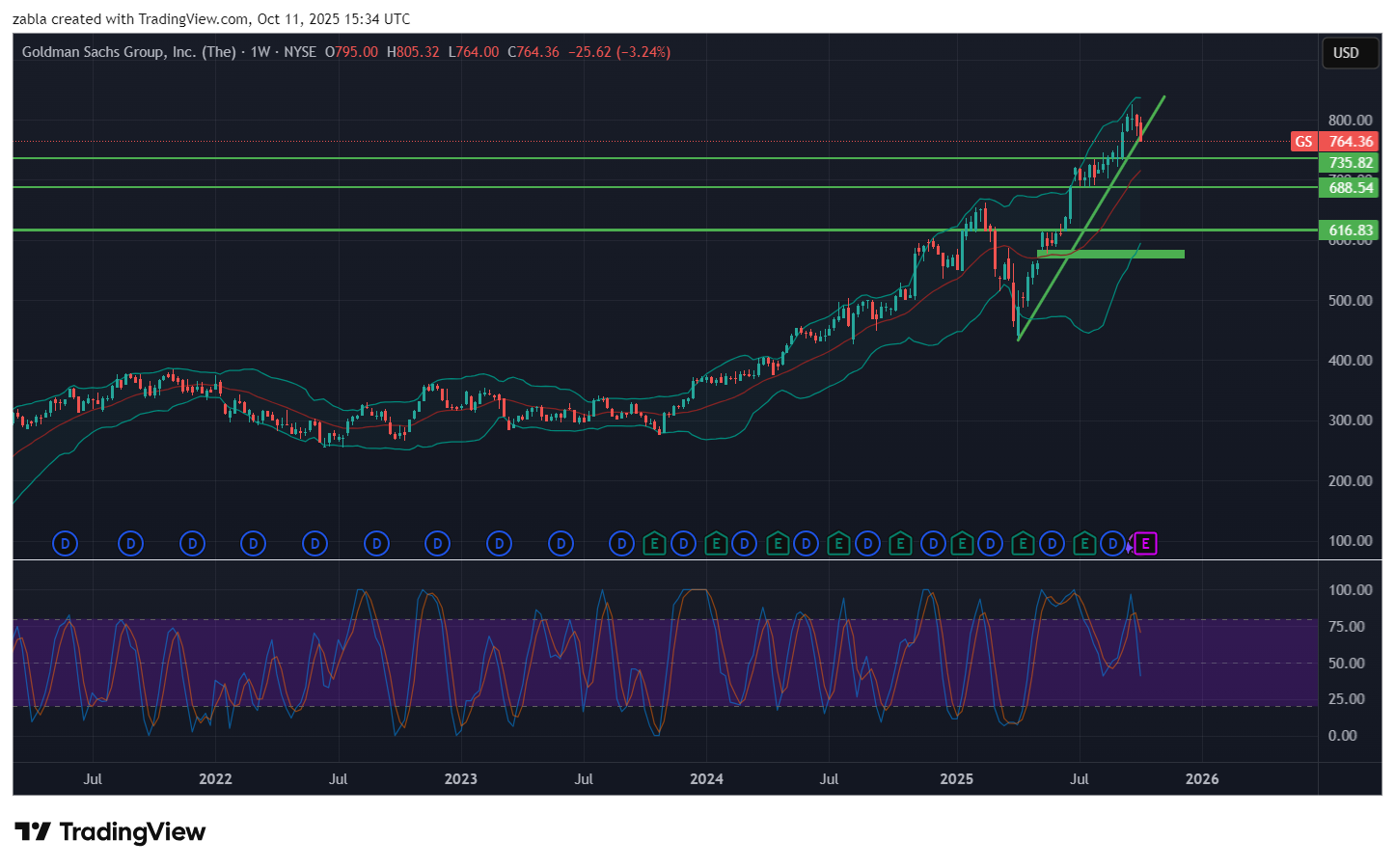 A részvény 8%-kal magasabb az időszaki csúcsától (825,25 USD), de 10,1%-kal magasabb az időszaki mélyponttól (694,05 USD). Az elmúlt egy hétben 3,2%-ot, egy hónap alatt pedig 2%-ot esett a Goldman Sachs árfolyama. A forgalom 41,9%-kal nagyobb a 20 napos átlagnál, ami fokozott érdeklődést jelez. A technikai trend jelenleg bearish /medve/, mivel az ár a rövid távú mozgóátlagok alatt van, ami konszolidációs vagy korrekciós fázisra utal a korábbi erős emelkedés után. A 20 napos volatilitás 1,1% körül alakul, ami viszonylag alacsony. A heti GS grafikon igen erőteljes csökkenést mutat. Ami a gyorsjelentésig tovább is csökkenhet. Fontos lesz a gyorsjelentés, hogy mit fog kommunikálni a befektetők felé, de egyenlőre csökkenős a trend. Főleg úgy, hogy 600 $ alatt maradt egy rés, ami óvatoságra int. Túlzottan meredek az emelkedés rövid távon! Forrás: több pénzügyi oldal