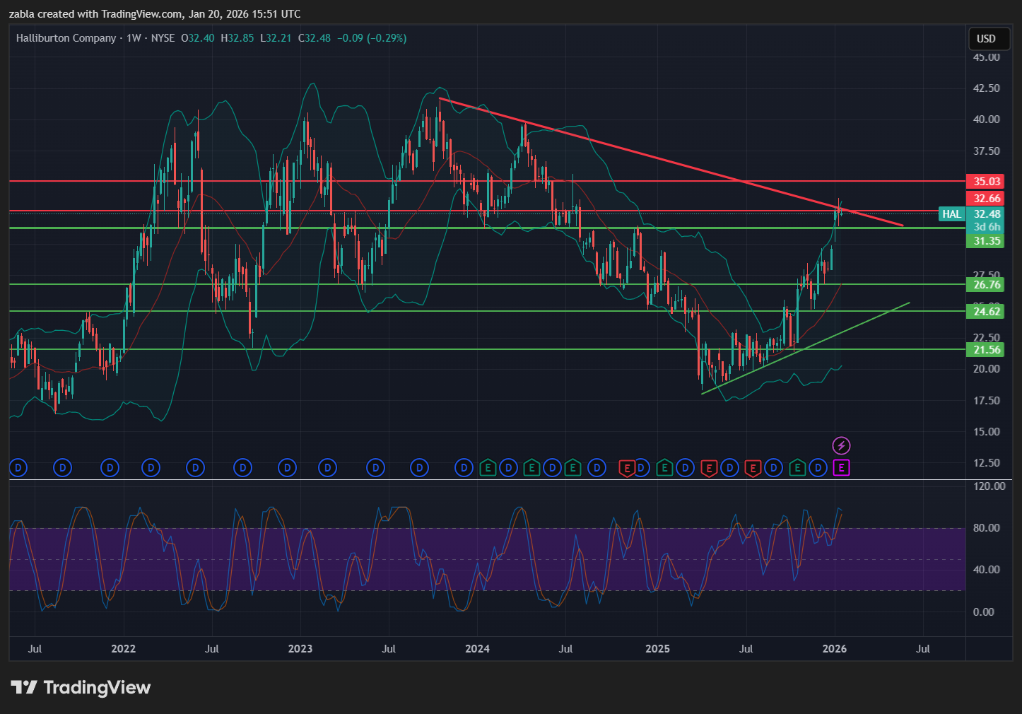 Összességében: A HAL-Halliburton heti szinten megtorpanást mutat, talán a közelgő jelentés miatt, mivel az utóbbi hetekben igen nagyot ment az árfolyam. 33 $ környékén beérkezett egy erős ellenállásba, itt mutatkozik némi bizonytalanság, sőt a heti RSI indikátor is lassan eladási jelzéseket mutat,de még óvatosan. Nagy az izgalom, mert azért a olaj ára igen nyomott, erősebb támasz a 31 $ környéki szint! forrás: több pénzügyi oldal