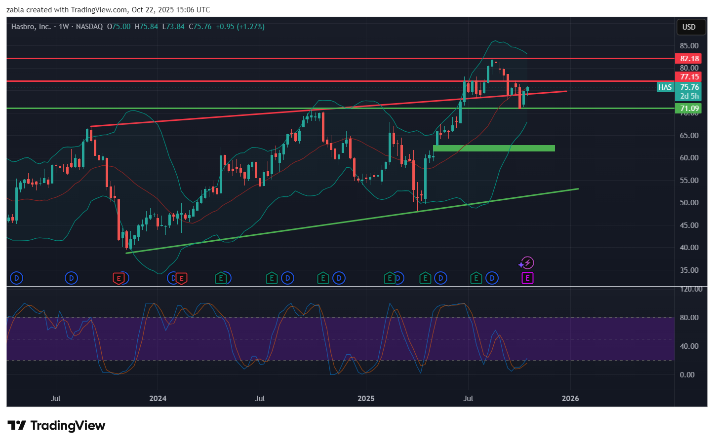 Hasbro játékosan emelkedik gyorsjelentés előtt. A HAS-Hasbro amerikai játékgyártó 2025. október 23-án megjelent a harmadik negyedéves gyorsjelentést, amely az elemzők rövidebb profitcsökkenését, de emelkedő árbevétellel várnak. A bevételi konszenzus 1,35 milliárd dollár, ami 5%-os növekedést jelent az előző évhez képest, különösen a Wizards of the Coast és a Digitális Játékok szegmens dinamikus teljesítménye miatt.