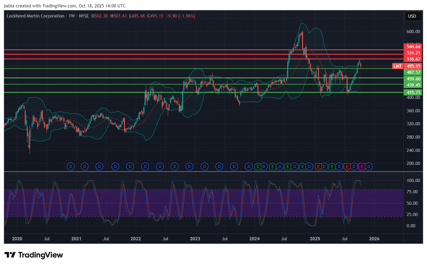 Lockheed Martin erőteljes emelkedés lefordult. A Lockheed Martin 2025. október 21-i gyorsjelentése valószínűleg erős bevételnövekedést, de gyengébb profitmarzsokat fog mutatni. Az elemzők a negyedéves árbevételt 18,5-18,6 milliárd USD körüli értékre várják, ami nagyjából 8%-os éves növekedést jelent, az F-35-ös sugárhajtású, rakéta- és űrrendszer-szállítmányok növekedésének köszönhetően. Az egy részvényre jutó nyereség azonban várhatóan 6,32-6,39 USD körül lesz, ami mintegy 7%-os csökkenést jelent a költségtúllépések és a titkosított repülőgépipari és helikopterprogramok költségei miatt. A vállalat megrendelésállománya várhatóan 6%-kal, 175 milliárd USD- re bővül, ami a védelmi rendszerek iránti folyamatos globális keresletet jelzi.