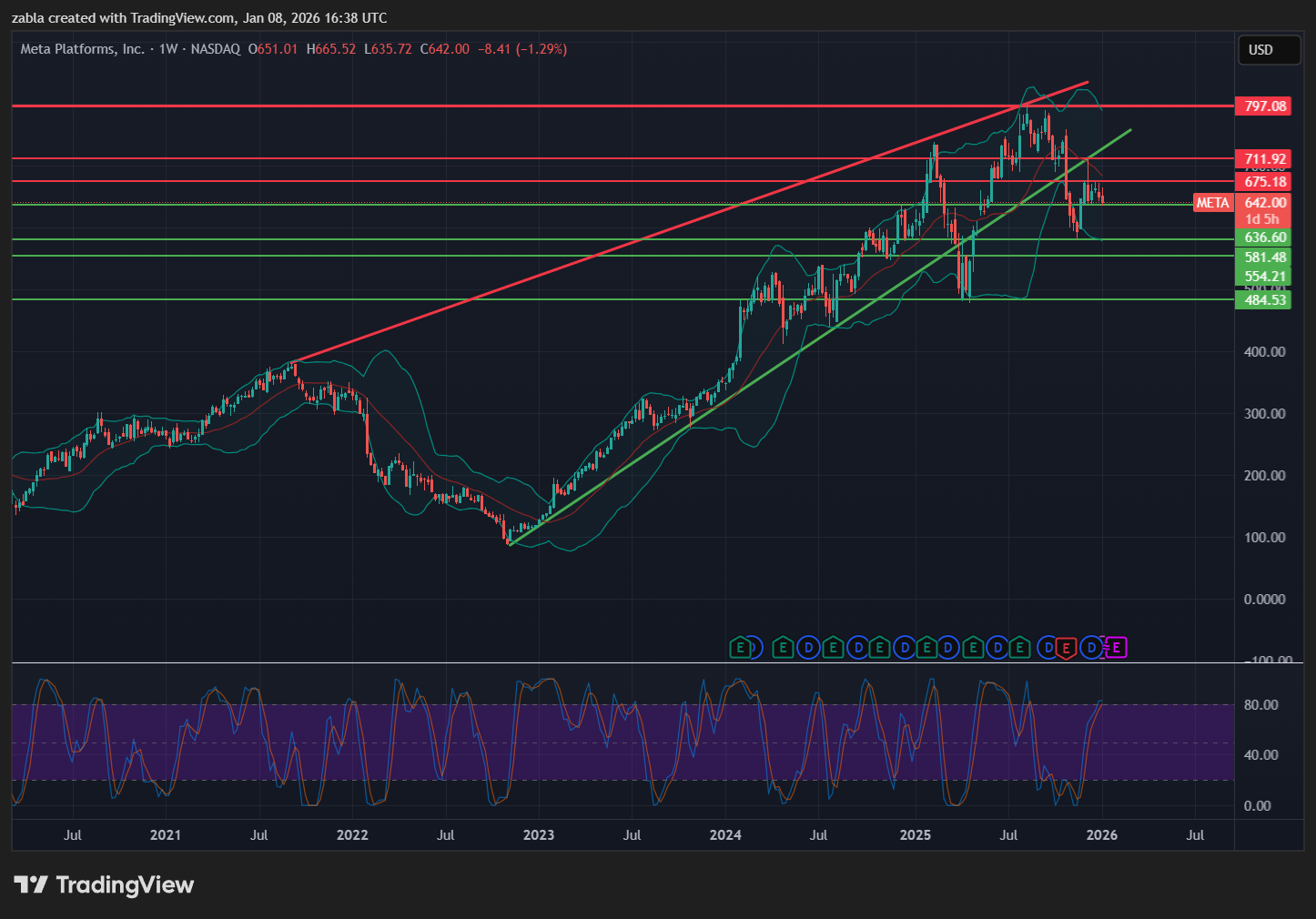 Meta további korrekciós szinten. A Meta Platforms (META) januárban enyhén korrekciós, de összképében továbbra is bullish technikai és befektetői környezetben mozog, erős AI‑sztorival és stabil profitlabilitással megtámogatva.