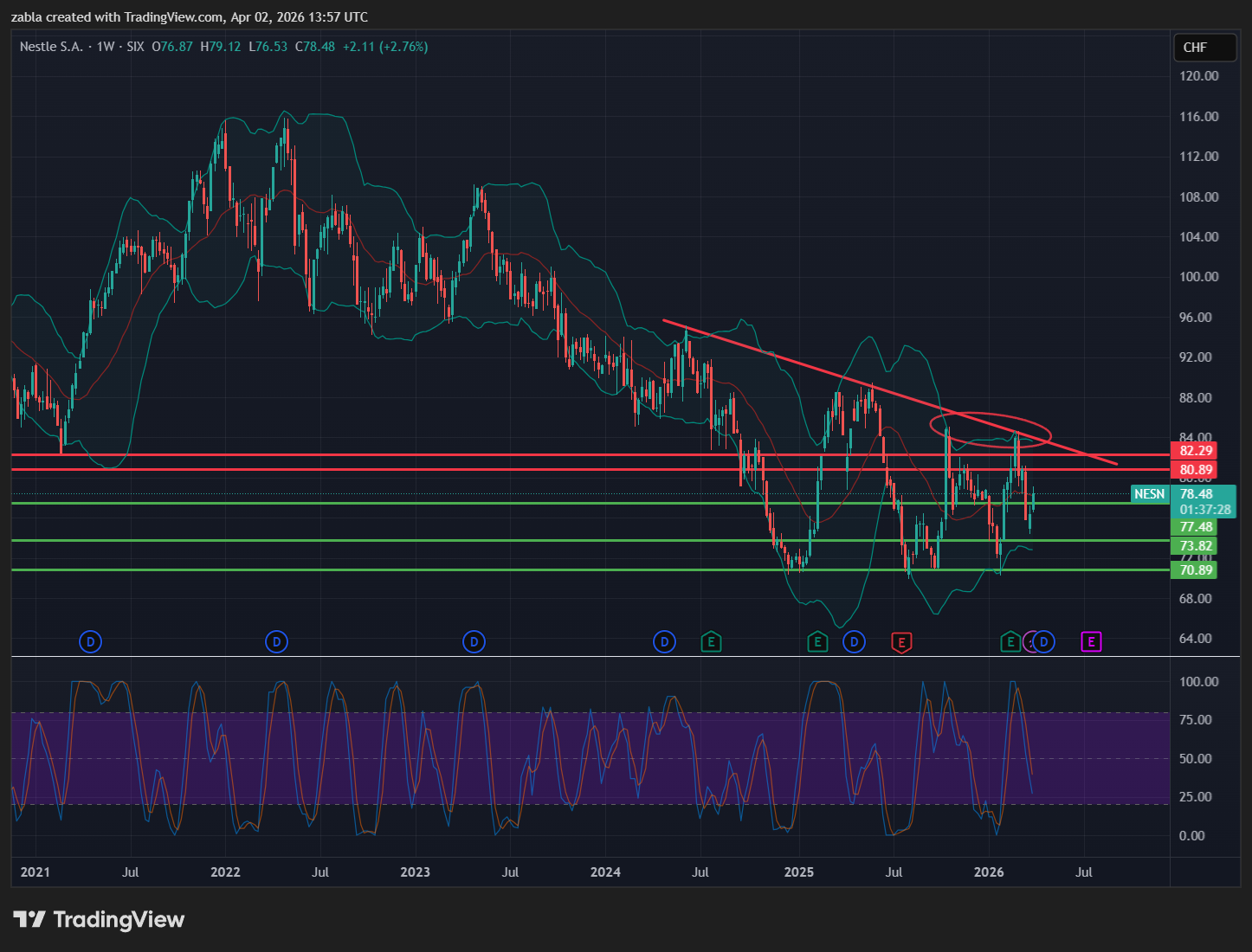 Összességében a Nestlé továbbra is a svájci gazdaság egyik legstabilabb pillére, de a növekedési pálya helyreállítása még folyamatban van. A befektetőknek érdemes szorosan követniük a nyersanyagárak alakulását és az április végi osztalékfizetési folyamatokat. A hosszú távú kilátások javulnak, de a rövid távú technikai kép még óvatosságra int a csökkenő trendcsatorna miatt. Te dönthetsz úgy, hogy a jelenlegi konszolidációt belépési pontként kezeled, de a stop-loss szintek szigorú betartása a 72-73 CHF-es zónában elengedhetetlen a kockázatkezelés érdekében.
