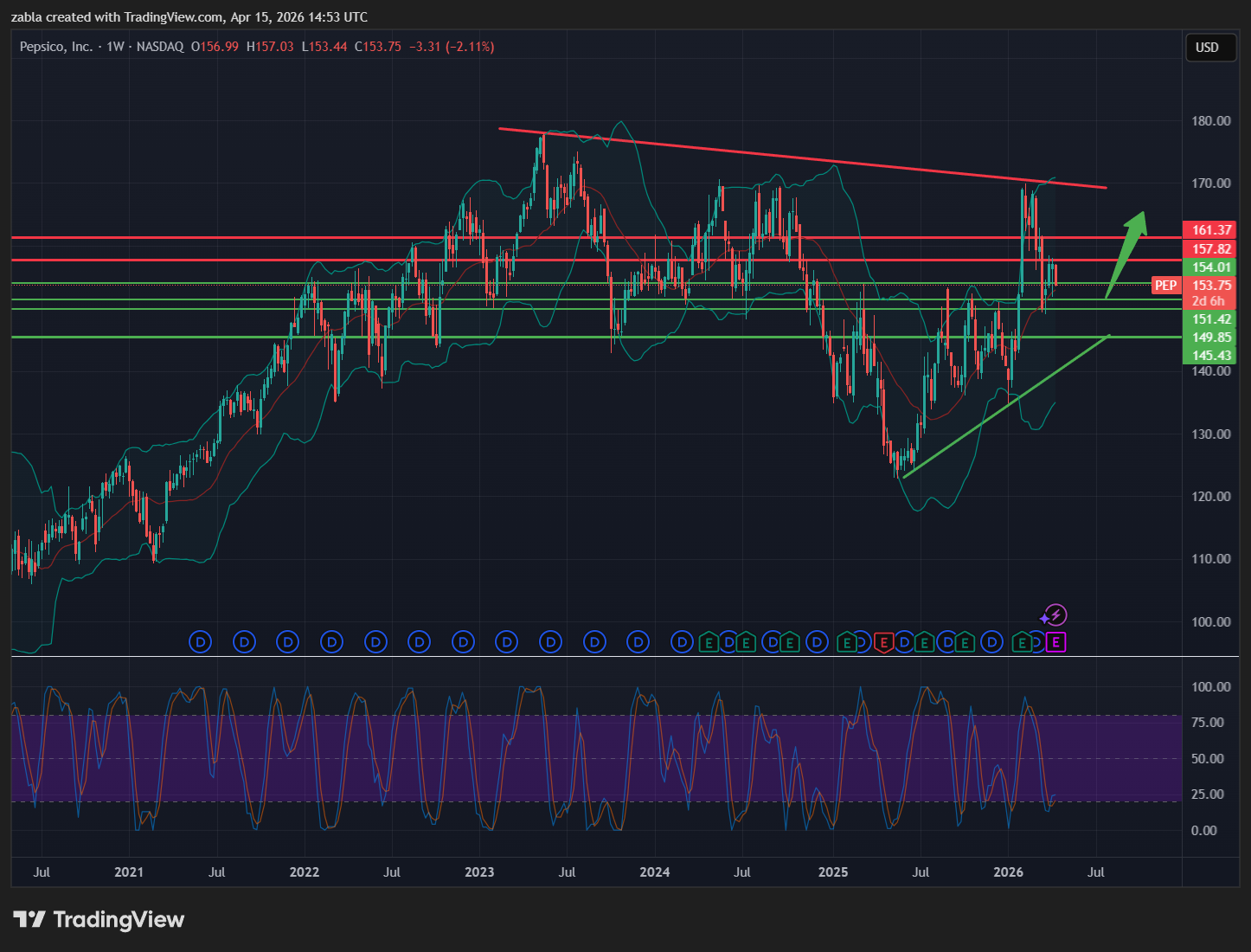 A középtávú elemzések szerint a PepsiCo egy emelkedő trendcsatornában mozog, ami azt jelzi, hogy a befektetők egyre magasabb áron is hajlandóak vásárolni a részvényt. Különösen fontos az “Inverz Fej-Váll” (Inverse Head and Shoulders) alakzat, amelyből a részvény nemrég tört ki a 148 dolláros ellenállási szint felett.