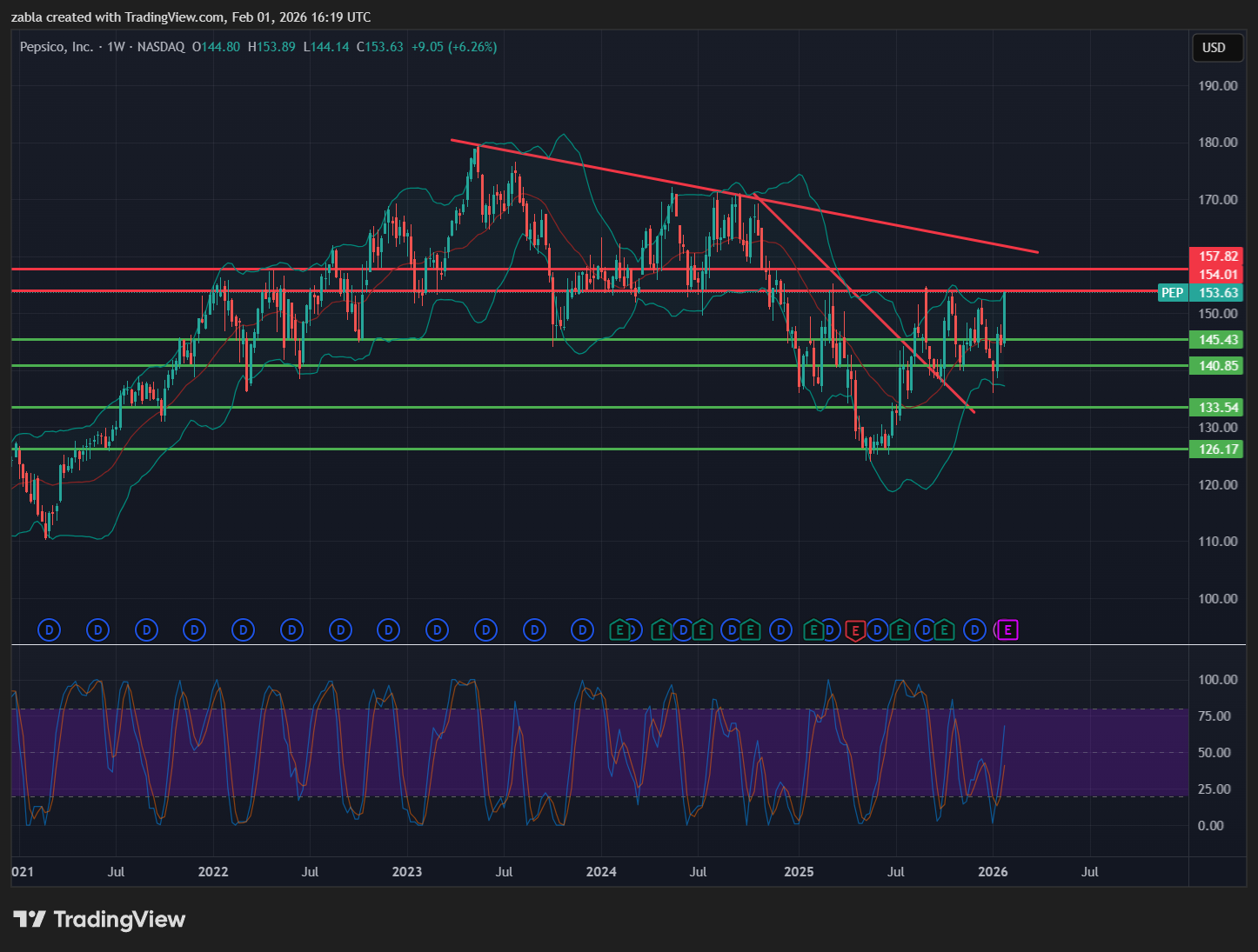 PepsiCo kellemes kitörési helyzetben. A PepsiCo (PEP) amerikai multinacionális cég, amely italokat, snackeket és élelmiszereket gyárt, február 3-án teszi közzé negyedéves jelentését. A 2026-os előzetes kilátások szerint 2-4% organikus bevételnövekedést várnak, core EPS-ben pedig 4-6%-os bővülést, ami a második félévben erősödhet. Emelkedést indíthat a részvény árfolyamát a várakozásokat felülmúló bevétel, a költségcsökkentési programok sikere és a részvény visszavásárlás folytatása.