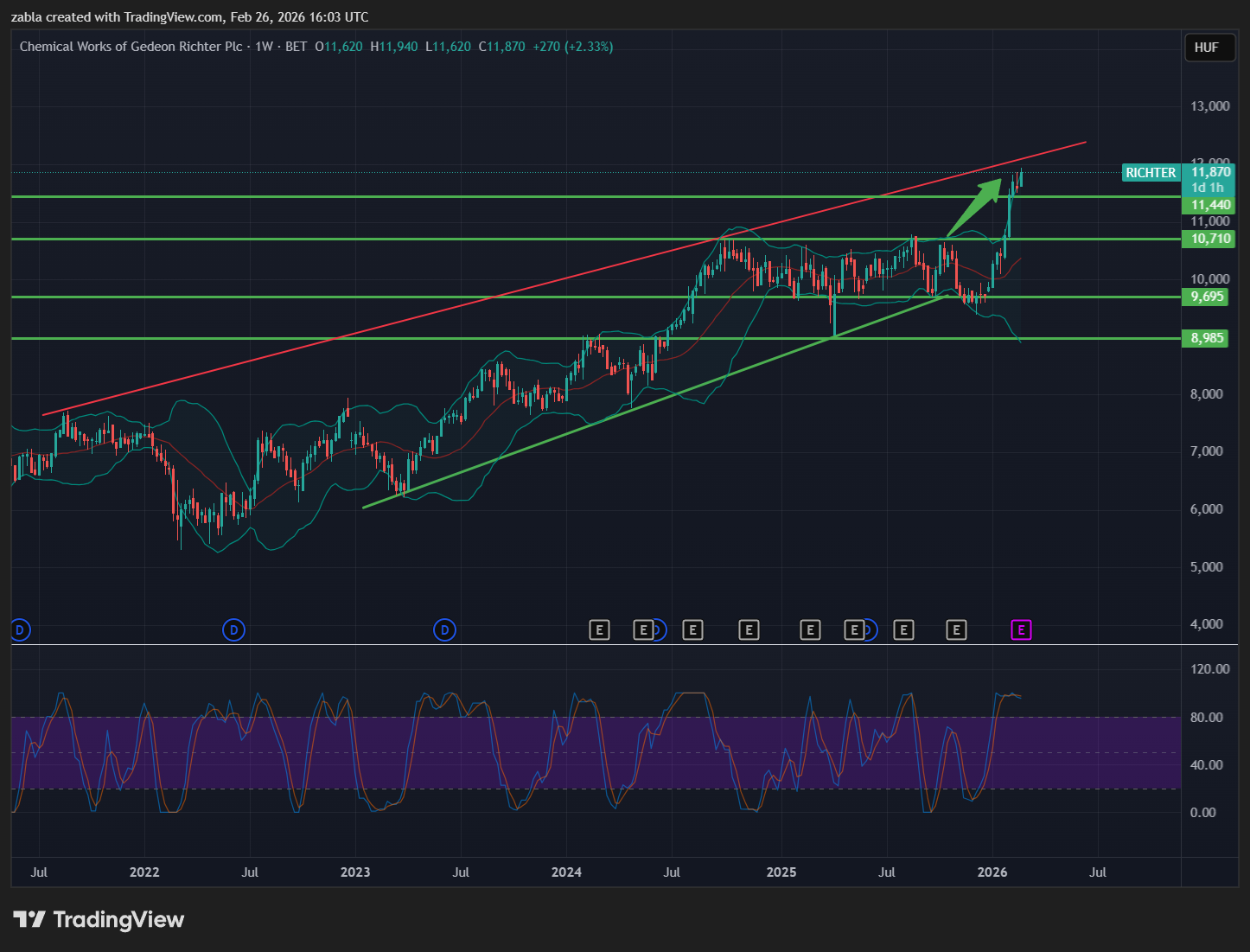 A február 27-i gyorsjelentés valószínűleg jelentős volatilitást hoz, a versenytársak erősek, az ETF-kitettség stabil háttértámaszt ad, technikailag pedig a jelentés utáni irány döntheti el a következő hetek trendjét. A heti Richter grafikon igen szépen közelít a 12.000 HUF árfolyam felé, 10.700 HUF árfolyamnál volt egy kitörés, amit a 11.440 HUF ellenállás tovább lökött felfelé. Így most a tényleges dolog holnapi nap dőlhet el, de még annyit érdemes ide írnunk, hogy a heti RSI indikátor túlvett tényezőt mutat. Figyelem és figyelem! Forrás: több pénzügyi oldal