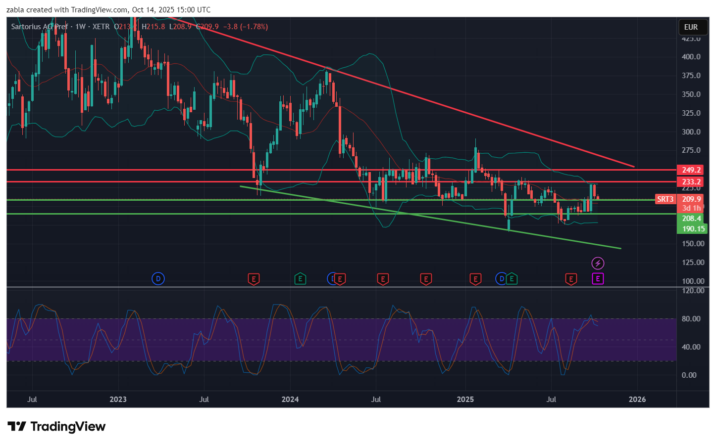 Technikai szempontból a Sartorius részvényei az utóbbi időben erősödtek, 2025. szeptember 30. és október 7. között körülbelül 14%-ot erősödtek. A részvény ára jelenleg 210-214 euró körül mozog, ami több idősíkon is emelkedő tendenciát mutat. A technikai mutatók túlnyomórészt pozitívak, a részvény a 8, 20, 50 és 200 napos mozgóátlagai felett forog, ami erős emelkedő trendre utal.