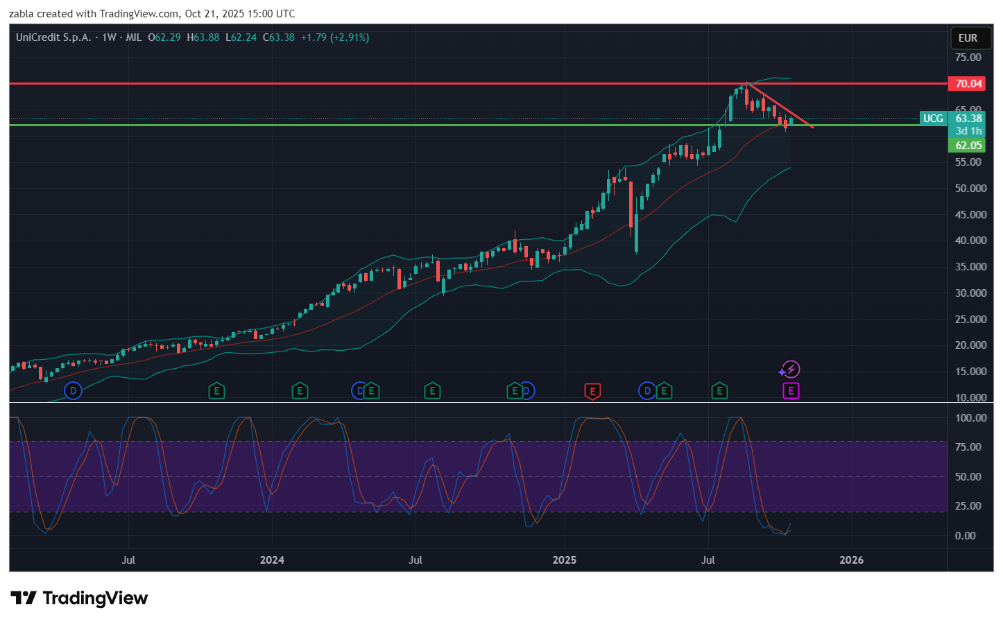 A heti Unicredit grafikon szinte egyszerű mint a szög. Amennyiben remek számok és kommunikáció érkezik a gyorsjelentéssel, akkor a jelzett ferde és vízszintes piros ellenállási vonalak a döntőek. Főleg a 70 €-os legutóbbi csúcs áttörése lehet fontos tényező. Továbbá az emelkedést az RSI indikátor is vételi jelzésbe fordult! Izgalmas lesz a holnapi gyorsjelentés az olasz banknál. Forrás: több pénzügyi oldal