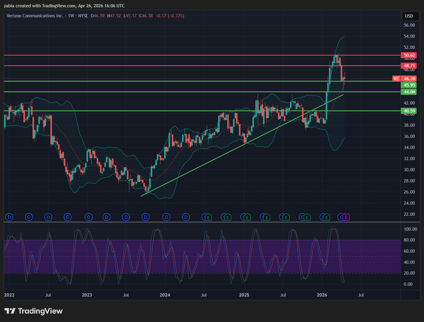 Verizon árfolyam támaszon jelentés előtt. A holnapi VZ-Verizon, 2026. április 27-i gyorsjelentés kapcsán a befektetői várakozások optimisták, mivel a Verizon (VZ) az év eddigi részében 12%-os emelkedést mutatott.