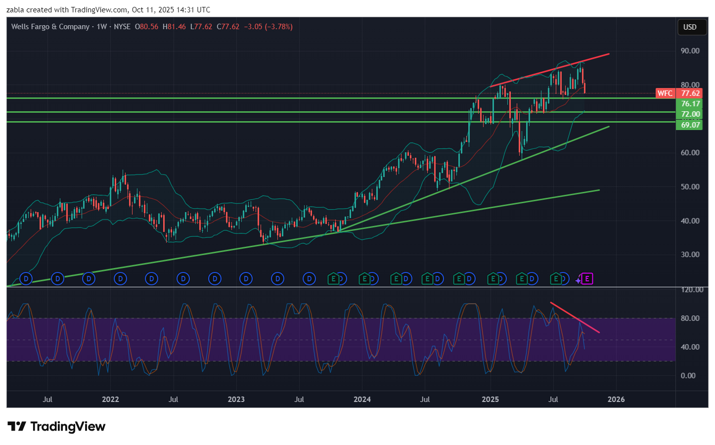 Wells Fargo október 14-i jelentése pozitív meglepetéseket jelenthet a befektetési banki és kereskedelmi bevételek erősödésével. A bank stabil osztalékfizetési képessége és az eszközkorlát feloldása hosszú növekedési potenciált rejt. Csak a technikai kép rövid távon bearish /medve/, a részvény jelentős támogatási szinteken teszteli magát, ami óvatosságra figyelmeztet. A heti WFC grafikon több mint rosszul néz ki. Úgy néz ki a technikai helyzetkép, hogy további csökkenést mutat az árfolyam. Lehet, hogy csalódásra készül a piac a jelentéssel kapcsolatba? -vagy csak bízonytalan! Az tény, hogy az árfolyam és az RSI indikátor divergál, ami erősíti a további csökkenést. Tehát csak óvatosan! Forrás: több pénzügyi oldal